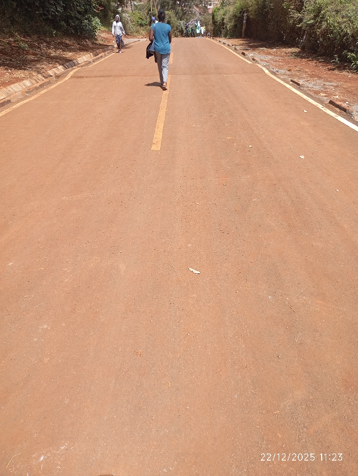 A reddish-brown road stretches into the distance. A yellow line marks the center. A person in a blue shirt walks away from the camera. To the left, another person rides a bicycle. A group of people stands further up the road. Both sides of the road are lined with greenery and a low curb. The date "22/12/2025" is visible in the bottom right corner.