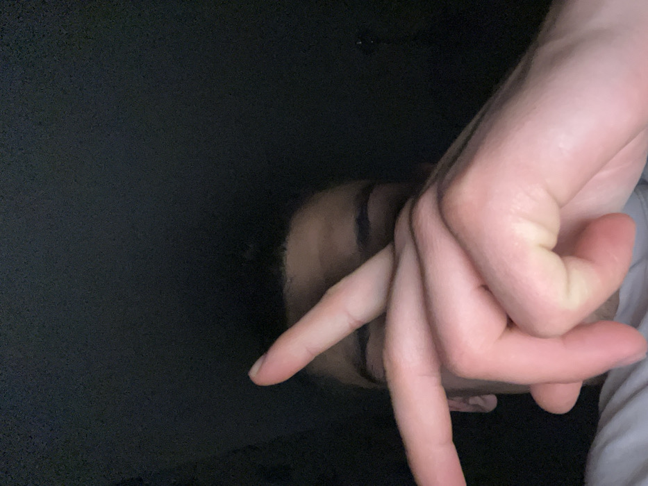 The image depicts a close-up, dimly lit scene featuring an individual in Sopot, Bulgaria. A person's upper face is partially visible, including the forehead and eyebrows, with dark, short hair. A fair-skinned right hand is positioned in the immediate foreground, intentionally obscuring the individual's eyes and the central portion of the face. The hand's index and middle fingers are extended and separated, forming a distinct 'V' shape, while the thumb, ring finger, and pinky finger are curled inward. A light-colored fabric, likely part of an article of clothing, is visible at the lower left edge. The background is uniformly dark and indistinct, offering no discernible environmental details.