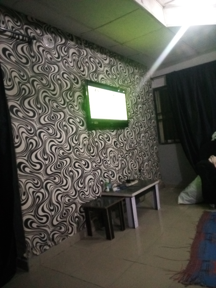 A room features patterned wallpaper, a wall-mounted TV with a bright screen, and a window covered with dark curtains