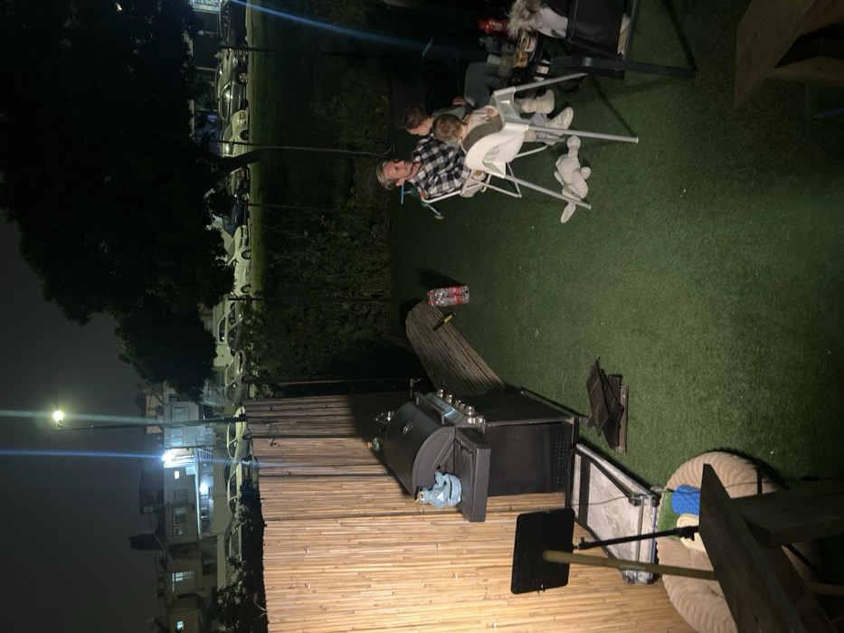 This image depicts a nighttime outdoor scene in what appears to be a private residential backyard or patio area in Kiryat Yam, Israel. The ground is covered with artificial green turf. In the mid-ground, a group of four individuals is seated around a small, dark patio table. The group consists of one adult male with light hair, wearing a plaid shirt, seated in a white chair. He is looking towards an adult female, partially obscured, who is holding a small child. Another child is seated in a white high chair next to the adult female, facing the group. A gray stuffed animal lies on the turf near the high chair. The table holds various items, including plastic bottles and containers. To the left, a tall bamboo privacy fence encloses the area. A black gas grill with a blue accessory on its side shelf is positioned against the fence. Below the grill, on the turf, are several dark, rectangular objects, possibly grill grates. A black music stand with a wooden support is situated near the grill. Further left, a round, beige braided pet bed with a blue and white toy is visible, next to a wooden structure. Rolled sections of bamboo fencing material lean against the main fence near the grill. Two red plastic bottles are on the turf near the rolled fencing. The background shows a street illuminated by a street lamp, with numerous parked cars (various sedans and SUVs) lining the curb. Beyond the street, residential buildings are visible under the night sky. A line of trees and dense foliage separates the backyard area from the street and background buildings.