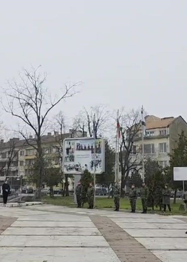 The video depicts a military parade taking place on a square in a town. Soldiers in green camouflage uniforms and red berets march across the square, some carrying Bulgarian flags. In the background, a building with many windows rises tall. The square is paved with gray and white square tiles. Trees without leaves line the edge of the square. People in civilian clothes are standing and observing the parade. There is a monument adorned with wreaths of flowers. The sky is overcast, suggesting it's a cloudy day.