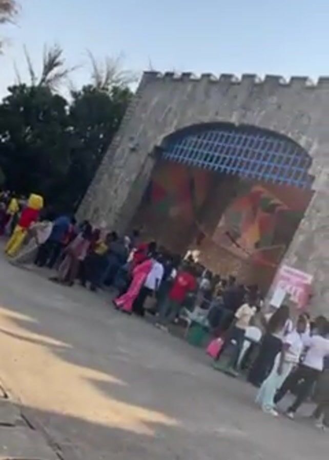 The video depicts a crowd of people gathered outside a building with a castle-like facade under bright sunlight. The building features a decorative archway with colorful geometric patterns and blue metal bars. A sign pointing toward the exit is visible. People are dressed in casual clothing, and some are standing while others are walking. Outside the building, there's a vendor selling goods from a small table. Palm trees and other greenery are visible in the background.
