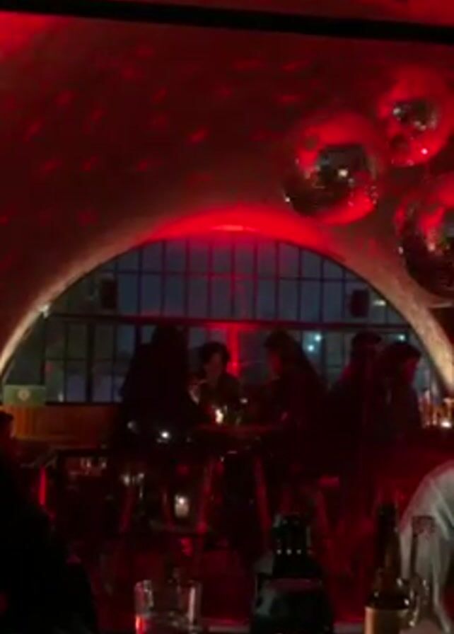 The scene takes place inside a dimly lit, arched bar illuminated by red lighting. Several disco balls hang from the ceiling, casting reflections. People are seated at high tables, some engaging in conversation. A few bottles and a glass of water are on the bar in the foreground. The background reveals a window with the cityscape visible outside.