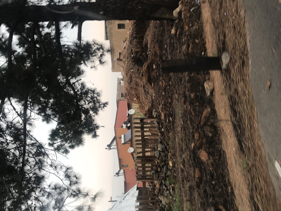 The image depicts a semi-urban scene in Sandton, South Africa, under an overcast sky. In the foreground, a dark-trunked tree with extensive pine-like foliage dominates the upper right and central portions, casting shadows and partially obscuring the view. Below the tree, the ground is covered with dark brown earth, scattered pine needles, and various debris including rocks and what appears to be discarded plastic. A grey asphalt surface, indicative of a road or pathway, runs horizontally across the bottom of the frame. A dark, possibly wooden or metal, post is visible vertically in the lower right-center. In the midground, to the left, a rudimentary wooden picket fence stands before a collection of large grey rocks and smaller debris. Behind this fence, several single-story structures with orange-red roofs are visible. These buildings feature multiple solar water heaters and satellite dishes installed on their rooftops. One structure on the far left has a corrugated metal roof. A large mound of reddish-brown dirt and debris is present in the mid-right, extending behind the fence and towards the background. In the background, additional residential structures with varying architectural styles and colors, including a lighter tan building, are discernible under a muted, hazy sky. No individuals or specific actions are visible in the scene.