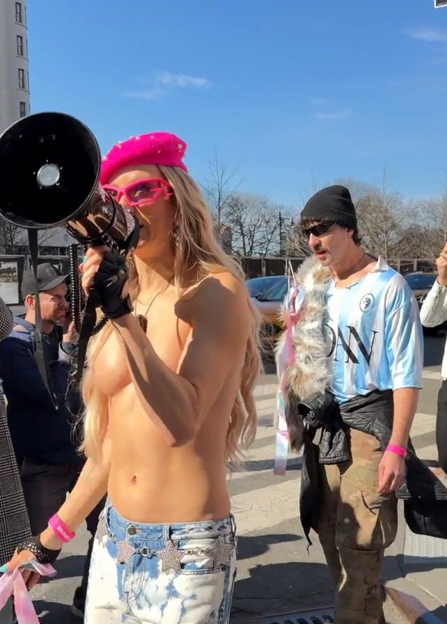 A group of people is gathered in a city, presumably protesting. They are walking on a crosswalk in the street. Some members of the group are wearing pink berets and holding up signs or raising their arms. One person is using a megaphone, and some are topless. They are chanting "Trans rights are human rights."