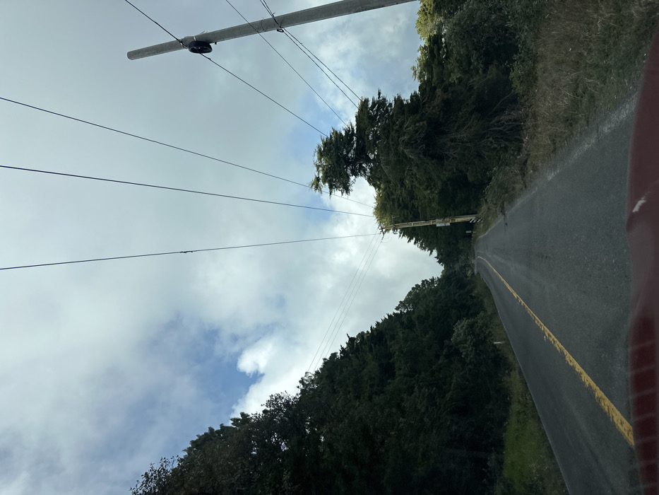 A road stretches uphill with a yellow dividing line. Trees and foliage flank the road on both sides. Power lines run parallel to the road, supported by utility poles. The sky is cloudy with patches of blue visible. The view appears to be from within a vehicle, looking upwards at an angle.