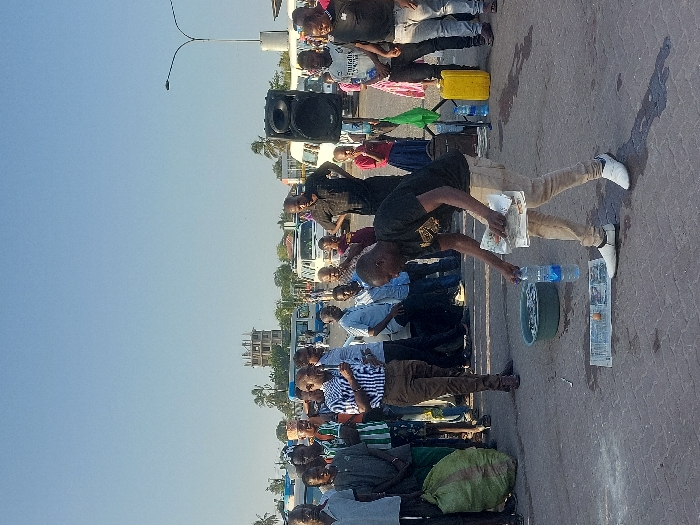 The image displays an outdoor public gathering on a paved surface, identifiable as a busy street or public transport hub within Dar es-Salaam, Tanzania, under a clear daytime sky
