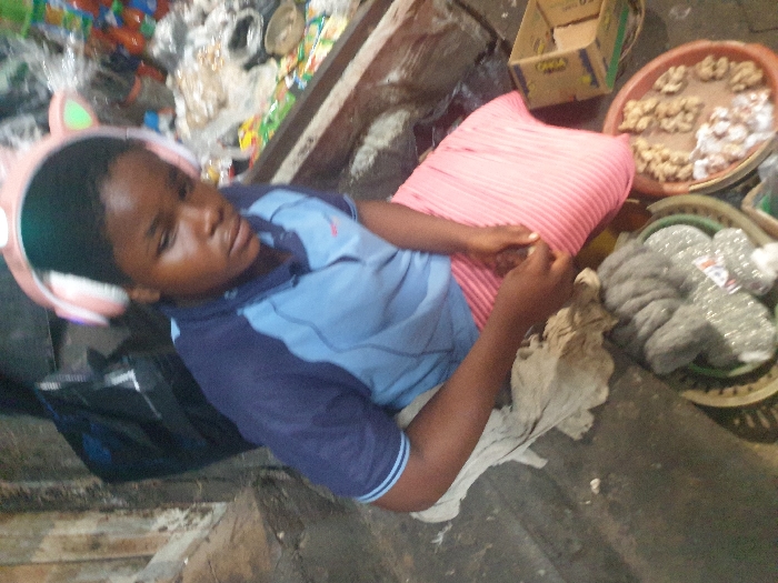 An overhead medium shot depicts an individual seated on the ground within a market stall environment in Nkpor, Nigeria