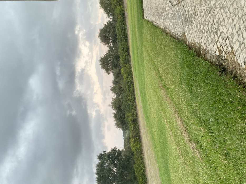 The image displays an outdoor landscape located in Cartaxo, Portugal, under an overcast sky. In the bottom right quadrant, a section of light-colored, textured paving, possibly concrete pavers, is visible. Adjacent to this, occupying the majority of the foreground and mid-ground, is a sloped expanse of green grass with visible variations in growth and shade, potentially indicating differing grass types or recent maintenance. A distinct line or edge runs diagonally through the grass, separating a lighter, less vibrant section on the left from a more lush, darker green section towards the right. Across the mid-ground, a dense, horizontal line of dark green trees and shrubs forms a natural barrier or treeline. Above this foliage, the sky is dominated by thick, grey clouds, with a subtle lighter, almost pinkish-grey band visible near the horizon line, suggesting either twilight or a partial clearing of the cloud cover. No individuals, animals, or specific man-made structures are discernible within the frame, aside from the paved surface.
