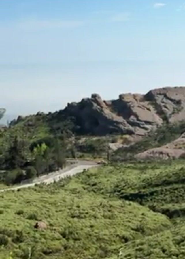 hill landscape under a clear blue sky. The foreground is covered with green vegetation, including low-lying plants and some trees. A winding paved road is visible, cutting through the hillside. In the distance, a dark-colored car can be seen driving along the road. The hill is dotted with large rock formations. A few houses and utility poles are also visible in the landscape. The overall setting appears to be a natural, hilly area with some signs of human presence.