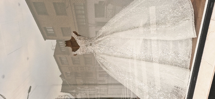 - "A white, voluminous, heavily embellished wedding gown is displayed on a brown, armless mannequin bust, viewed through a reflective shop window" by FM-uLzcF2, licensed under CC BY 4.0
