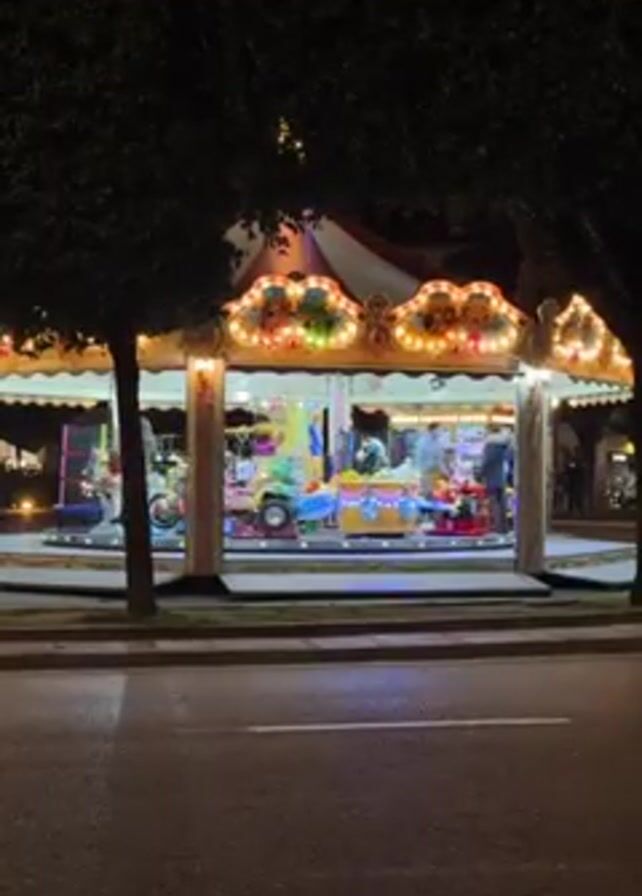 carousel at night, brightly lit with various colors. The carousel is surrounded by trees, and a road with a median runs in front of it. People can be seen riding the carousel.