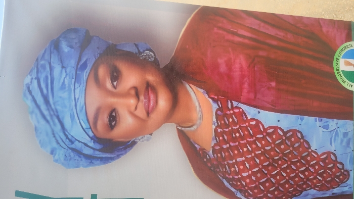 A vertical outdoor banner, positioned in Badiko, Nigeria, displays a waist-up portrait of an adult female