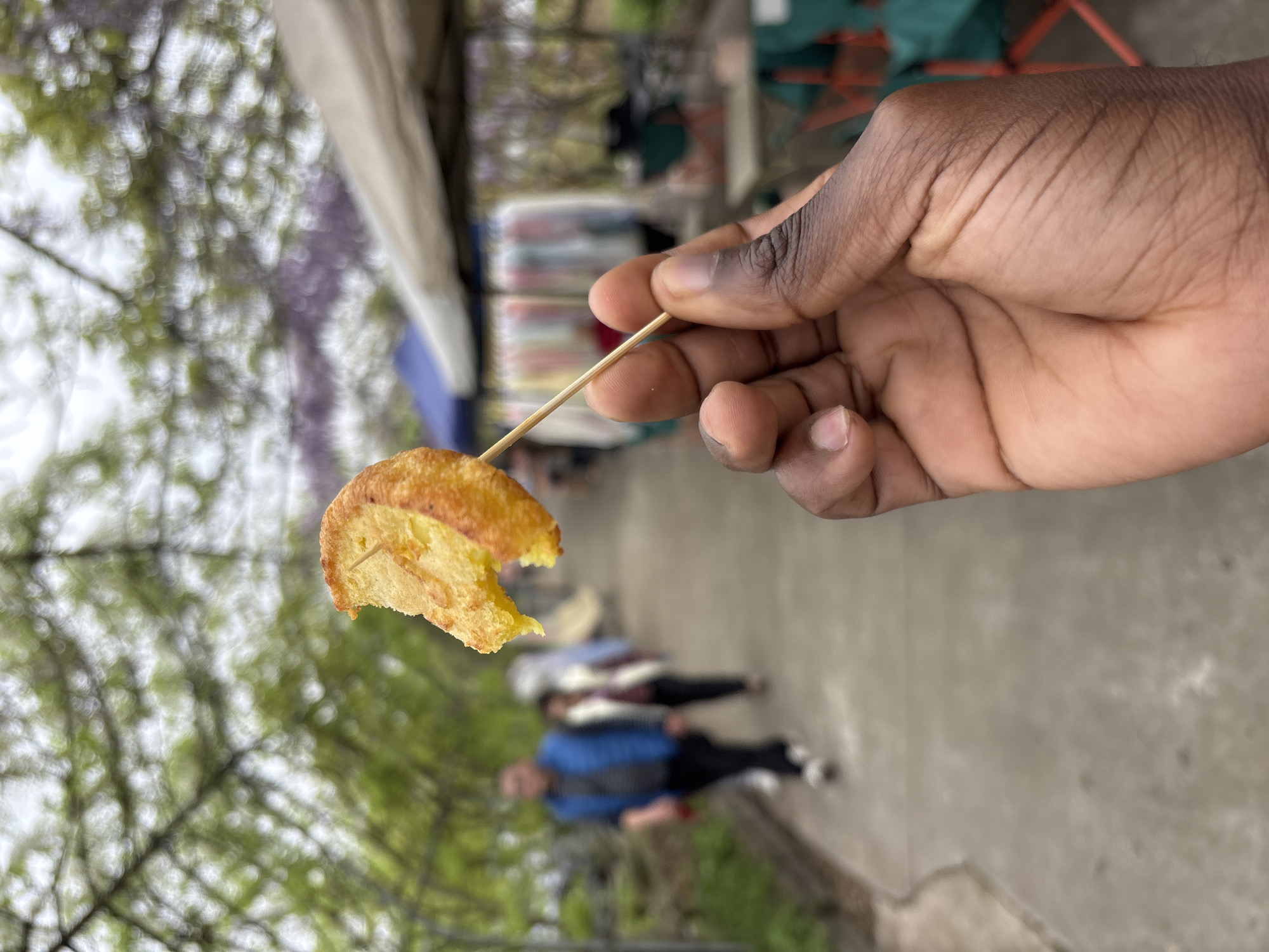 - "A close-up shot shows a dark-skinned hand holding a piece of what appears to be fried food impaled on a wooden skewer" by FM-hd42B3, licensed under CC BY 4.0