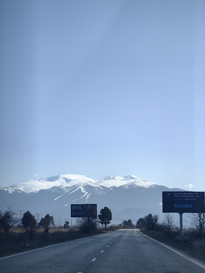 An outdoor, eye-level shot depicts a rural road leading toward snow-capped mountains under a clear blue sky, located near Shiroki dol, Bulgaria