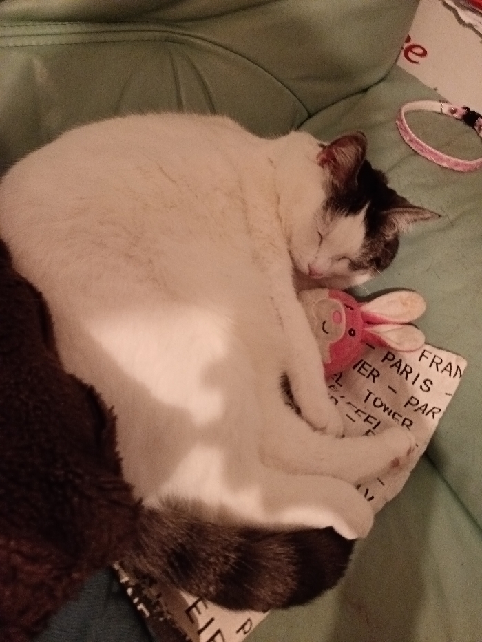 - "A white domestic cat with dark brown and black markings on its head and tail is observed sleeping, curled on its right side, within a residential interior in Bischheim, France" by FM-QWmIy2, licensed under CC BY 4.0