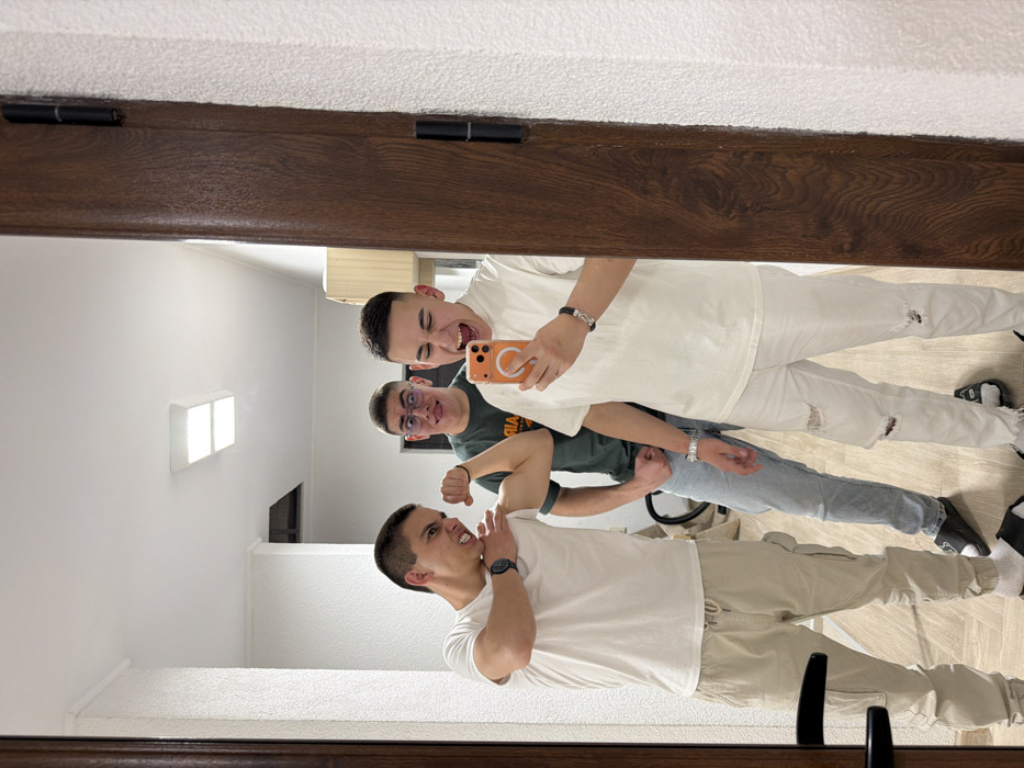 Three young adult males are reflected in a large, rectangular mirror within an indoor setting in the city of Panagyurski kolonii, Bulgaria. The mirror occupies the majority of the frame, bordered on the right by a dark brown wooden frame with visible black door hinges. The background, reflected in the mirror, consists of white, possibly textured walls, a light-colored wooden floor, and a white ceiling with a rectangular, flush-mounted double light fixture. From left to right in the reflection: 1. A male with short, dark hair, wearing a white t-shirt, light beige cargo jogger pants, white socks, and black slides. He flexes his right bicep with his left hand while making a strained facial expression, looking towards the camera. A dark smartwatch is visible on his left wrist. 2. A male with short, dark hair and eyeglasses, wearing a dark green t-shirt and light blue jeans. He has both hands on his hips and is making a humorous face with his tongue extended and eyes crossed, looking towards the camera. A silver-colored watch is on his left wrist. 3. A male with short, dark hair, wearing an off-white t-shirt, white ripped jeans, and white sneakers with black accents. He is holding an orange-cased smartphone with a white circular accessory on the back in his right hand, extending it towards the mirror to take the photograph. His mouth is wide open in an expression of excitement or a shout, and his eyes are squeezed shut or squinting. A dark wristband is on his left wrist and a silver-colored watch is on his right wrist. In the reflected background, a light wooden cabinet or shelf unit is partially visible on the right, and an indistinct object, possibly a rolled mat or hose, lies on the floor behind the middle male.