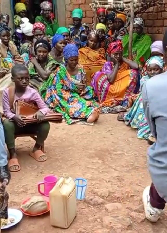 A group of at least 30 adults and one child are gathered in an outdoor courtyard, primarily sitting on the ground, along a brick wall. Two men are seated on wooden chairs in the foreground, while a younger child with a purse sits on a third chair between them. A man in a grey suit is standing and appears to be gesturing or speaking to the group, with another man in a suit standing behind him. In front of the seated individuals, there are several objects placed on the ground, including a wooden figurine on a plate, a loaf of bread, a yellow canister, and a pink mug. The ground appears to be dirt. The people are wearing a variety of casual clothes, including traditional colorful headscarves and outfits. The overall atmosphere suggests a gathering or ceremony of some kind.