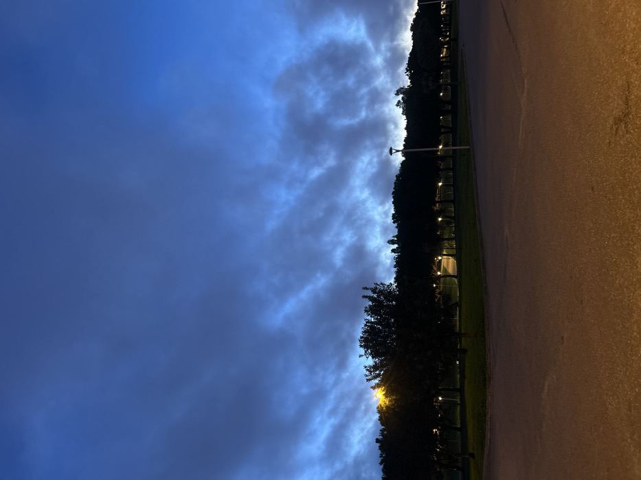 A twilight scene displays a deep blue sky with textured clouds. Adjacent to the sky, a line of trees stands, punctuated by evenly spaced lampposts that cast a warm, yellow light. The ground is divided between a strip of green grass and a smooth, light-colored asphalt surface, contrasting the cool tones of the sky and the darkness of the trees.