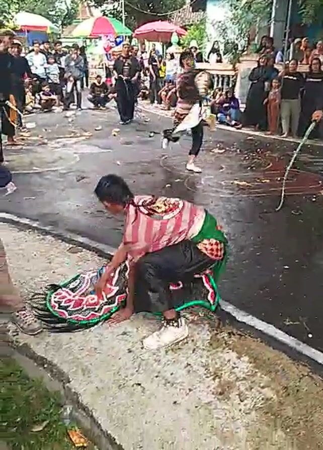 two individuals performing a martial arts routine in front of a crowd. The ground appears wet. The individual on the right is wearing black clothing, while the individual on the left is wearing a pink and black patterned top with black bottoms. The person in pink and black is thrown to the ground. The crowd is watching the performance. The video is shot outdoors. There are buildings and trees in the background.