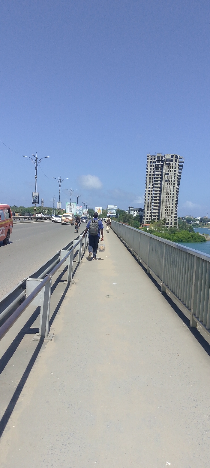 The image captures an elevated roadway and pedestrian bridge in Junda ward, Kenya, under a clear blue sky with minimal scattered clouds. The scene is viewed from a ground-level perspective, looking along the bridge's length. On the left, a multi-lane asphalt road carries vehicular traffic, including a red van in the foreground, a light-colored public service vehicle (matatu), and other automobiles further down. A cyclist is also visible on the roadway. The road is lined with multiple grey lamp posts featuring multi-arm designs and attached banners or advertisements. Parallel to the road on the right is a concrete pedestrian sidewalk, separated by a grey metal railing. A person, dressed in a blue shirt, dark trousers, and a grey backpack, walks away from the camera on this sidewalk, carrying a clear plastic bag in their right hand. Further ahead on the same sidewalk, another individual in light-colored clothing is also walking. The outer edge of the pedestrian path is bordered by another grey metal railing. Beyond the outer railing, a body of blue water, consistent with an estuary or channel, is visible. Green vegetation, likely mangroves, lines the immediate banks of the water. In the background, a prominent unfinished multi-story concrete building with numerous visible structural openings stands tall, indicating ongoing construction. Distant structures and land are also discernible. The environment is brightly lit, casting pronounced shadows from the railings onto the sidewalk.