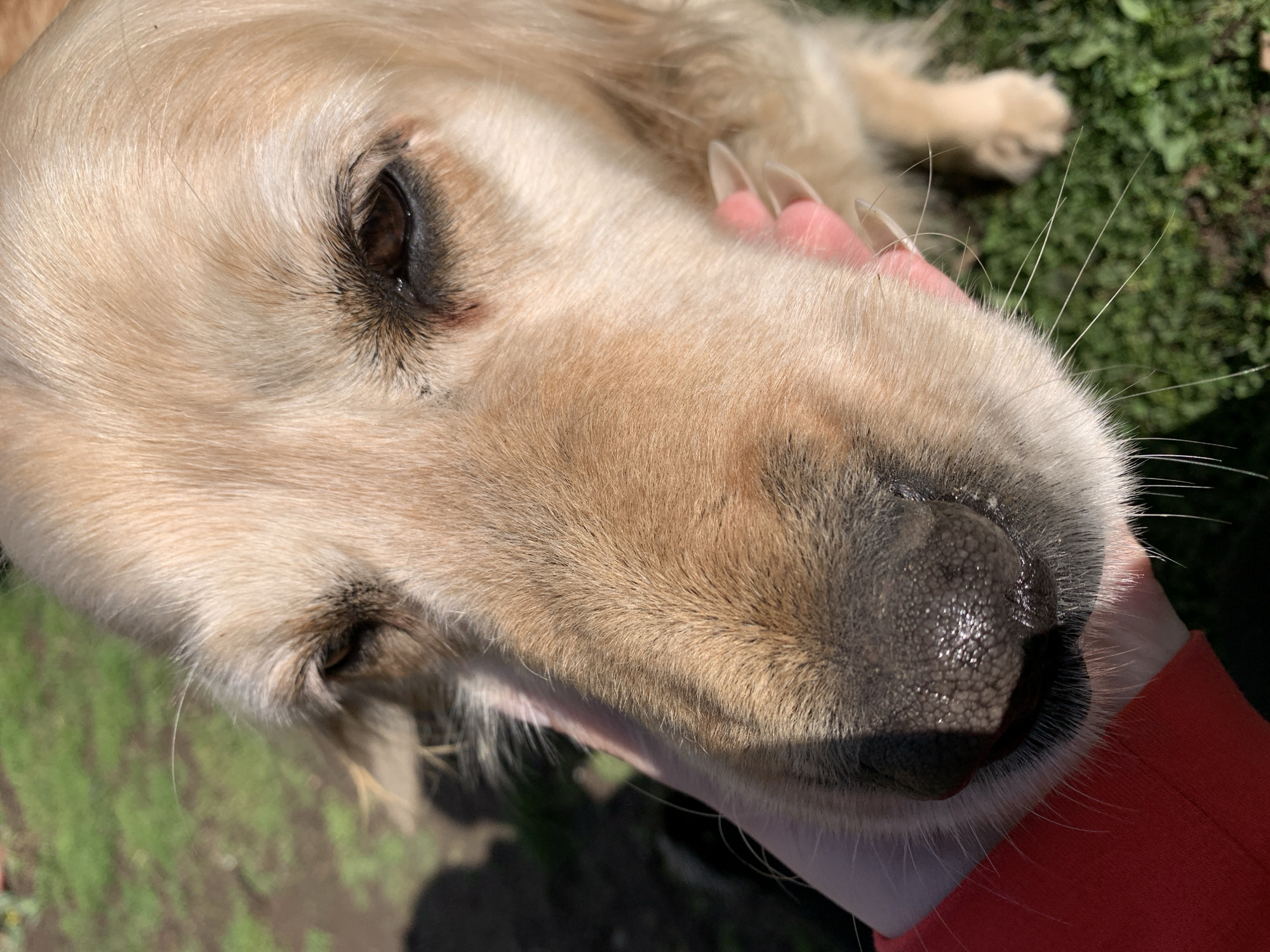 The image displays a close-up perspective of a Golden Retriever dog's head and upper body in Lehchevo, Bulgaria. The dog has light golden fur, dark brown eyes with some dark staining around the tear ducts, and a moist black nose. A human hand, with pale skin and a red sleeve, is positioned against the dog's left cheek and snout, making physical contact. The visible fingernails are artificial, clear, and feature pink tips. The dog's eyes appear partially closed. The background is out of focus, showing green grass and dark shadows, indicative of an outdoor, sunlit environment. A prominent shadow extends across the dog's snout and into the foreground.