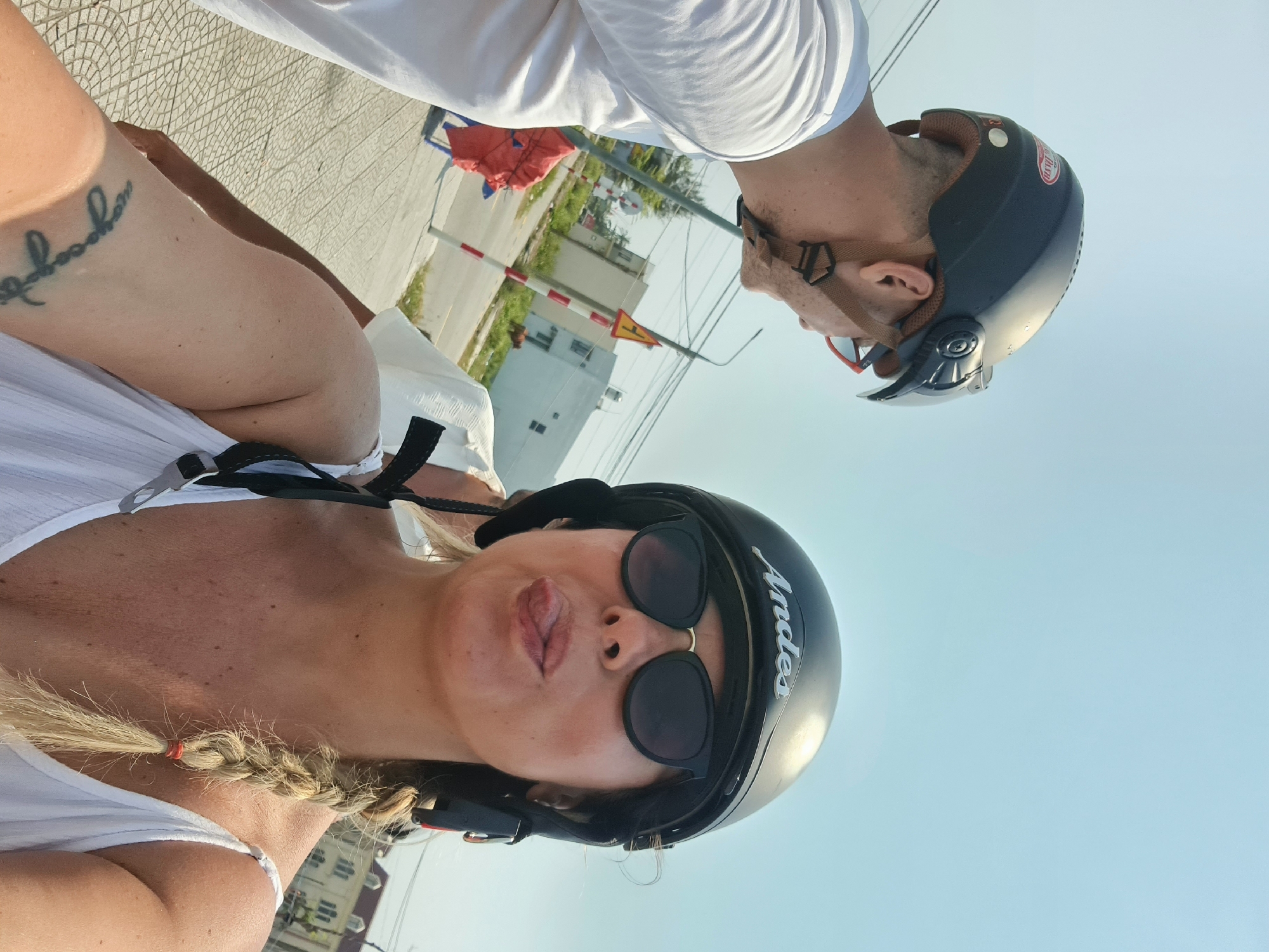 Two people are wearing helmets and riding a motorcycle in Huế, Vietnam. The person in the foreground has a blonde braid, sunglasses, and is sticking their tongue out. The other person is behind them, also wearing a helmet. Buildings and streets can be seen in the background.