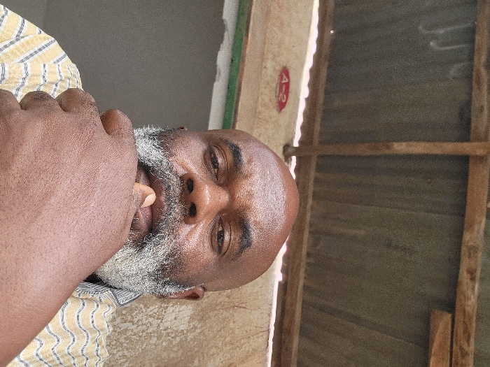 The image presents a close-up portrait of an adult male with dark skin, a bald head, and a full grey and white beard and mustache. He wears a collared shirt with horizontal yellow and white stripes. His right hand is raised, with his index finger resting against his lower lip. He maintains direct eye contact with the camera. The background features a light-colored wall section, partially visible, upon which a red rectangular sign bearing the characters "A-2" in white is affixed. Above this wall, a structure composed of rough-hewn wooden beams supports a corrugated metal roof. The architectural elements are consistent with common construction in Maiburiji, Nigeria; however, the precise location within the city is not further discernible from the depicted scene.