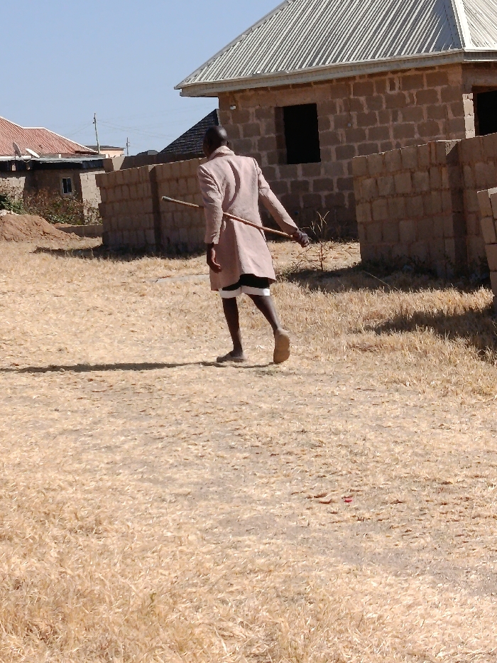 A solitary male figure is depicted walking across a dry, sparsely vegetated field under a clear blue sky in Dong, Nigeria. The individual, viewed from behind, has dark skin and appears bald. He wears a light-colored, long-sleeved tunic or coat that extends to mid-thigh, dark shorts, and white undergarments. A light-brown sandal is visible on his left foot; his right foot is partially obscured. He holds a slender, dark wooden stick horizontally in his right hand, extended towards his left. The ground is dry earth covered with sparse, light-brown grass, casting distinct shadows indicating direct sunlight. A small reddish piece of debris is visible on the ground in the foreground. In the background, to the right, an unfinished building constructed from light-brown concrete blocks features a light-colored corrugated metal roof and two dark, rectangular window or door openings. A low wall made of similar blocks extends from this structure. Further in the background, to the left, a structure with a reddish-brown tiled roof and a white satellite dish is visible, along with another darker-roofed building.