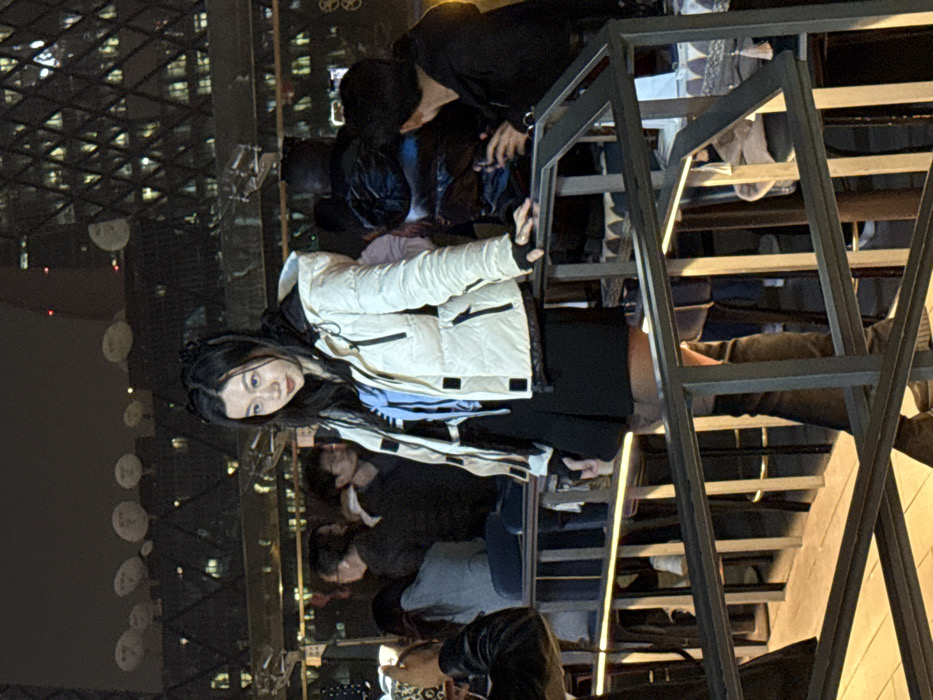 The image captures a nighttime urban scene in Beijing's Chaoyang District, with the distinct illuminated lattice of the CCTV Headquarters building visible in the background. The primary subject is a female positioned on a dark metal-railed platform or staircase. She wears a cream-colored puffer jacket with black trim over dark and light blue layers, a black mini skirt, dark opaque hosiery, and black over-the-knee boots. Her long dark hair features two small, dark, braided accents on top. Her left hand rests on the railing, and she gazes to her right. To the immediate left, a person's hands hold a smartphone, pointing it towards the subject, indicating photography. Several other individuals are present in the blurred background, some holding phones, dressed in dark winter attire. The platform floor appears to be planked. Small, white, spherical lights are visible strung horizontally across the upper background.