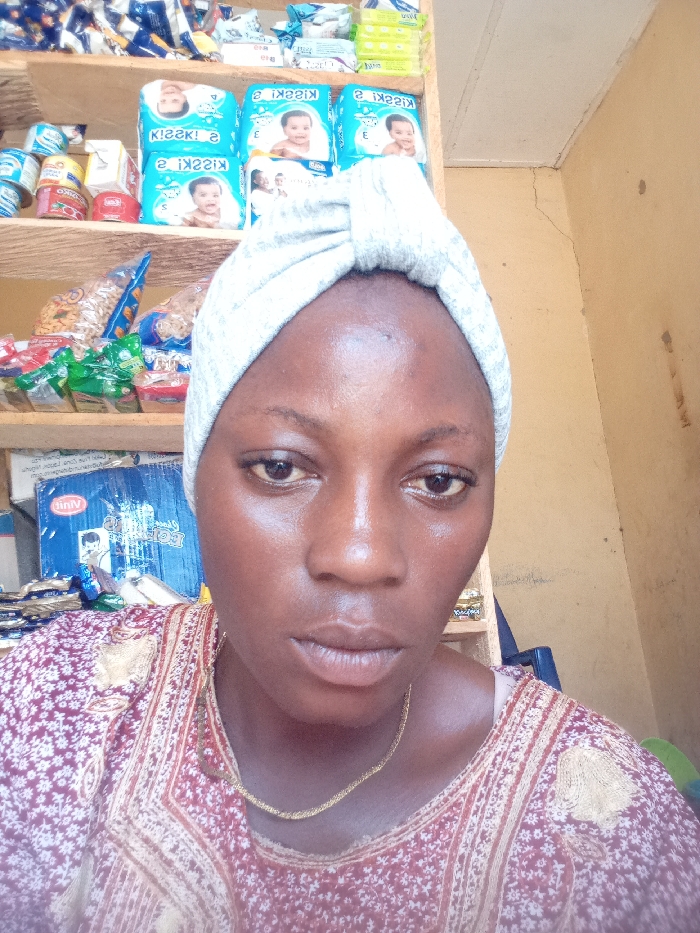 A close-up, head-and-shoulders portrait of an adult female of African descent is captured within what appears to be a small retail shop or kiosk