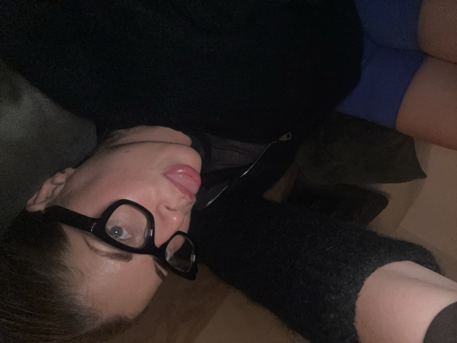 A selfie shot, turned sideways, shows a woman with black glasses and her tongue sticking out. She's wearing a black top and has on blue shorts. The background includes a couch and a glimpse of a hardwood floor. The lighting is somewhat dim, creating a casual and slightly dark atmosphere.