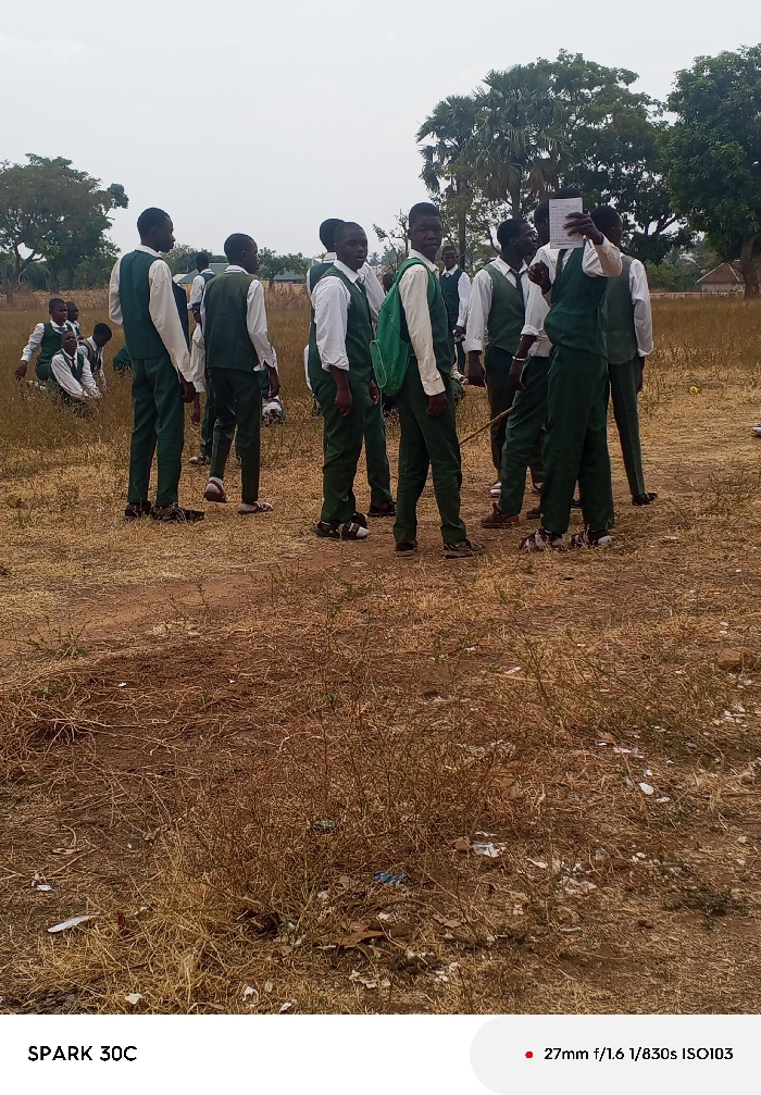 An outdoor scene in Akwanga, Nigeria, depicts approximately 15-20 young males, likely students, gathered on an open, unpaved area