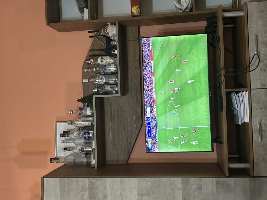 The image displays an interior residential setting, likely a living room. The background wall is painted a uniform peach-orange color. A multi-sectional entertainment unit, constructed from light wood-grain materials, is prominently featured. On the left, a tall, greyish, textured vertical cabinet section is visible. A black flat-screen television, branded "CROWN," is centrally positioned within the unit. The screen displays a football (soccer) match in progress, featuring players in white and red uniforms on a green pitch. A scoreboard overlay indicates "LIV 0 0 GAL," a time of "16:28," and "UEFA CHAMPIONS LEAGUE" along with "GATORADE" branding. Above the television, two staggered, horizontal shelves, matching the wood-grain of the unit, are affixed to the wall. These shelves hold a collection of approximately 14-16 empty or partially filled liquor bottles, including brands such as Absolut Vodka, Beluga, Kristova, Zubrówka, and Paddy whiskey. Also on these shelves are a small green decorative Christmas tree, a framed item, a black electronic router with visible antennas, a small snow globe, and a white gnome figurine wearing a red hat. Below the television, on the entertainment console's lower shelf, a stack of papers or notebooks is present. Various black cables are arranged loosely, connecting to small electronic devices, including a compact black box and two small black speakers positioned to the right of the TV. No individuals are depicted in the scene.