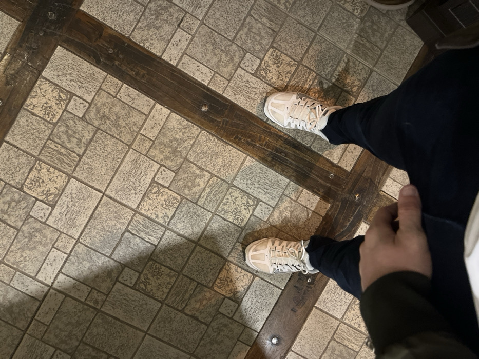 The image displays a high-angle, downward view of a standing individual's lower body and the floor