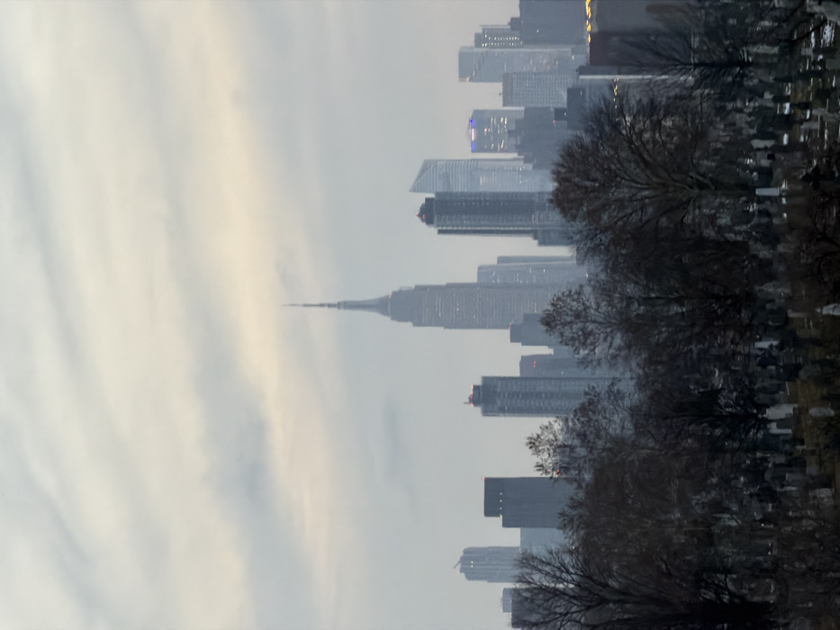 A city skyline is seen through bare branches, likely viewed from a cemetery. The Empire State Building is a prominent landmark amidst other skyscrapers. The sky is overcast and muted in color, creating a hazy atmosphere. Tombstones are faintly visible among the trees, adding a contrasting element between urban development and mortality. The picture may have been taken on a gloomy day.