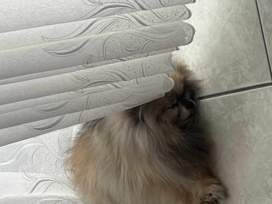 A fluffy, brown and beige Pekingese dog rests near a tiled wall, partially hidden behind patterned white window blinds