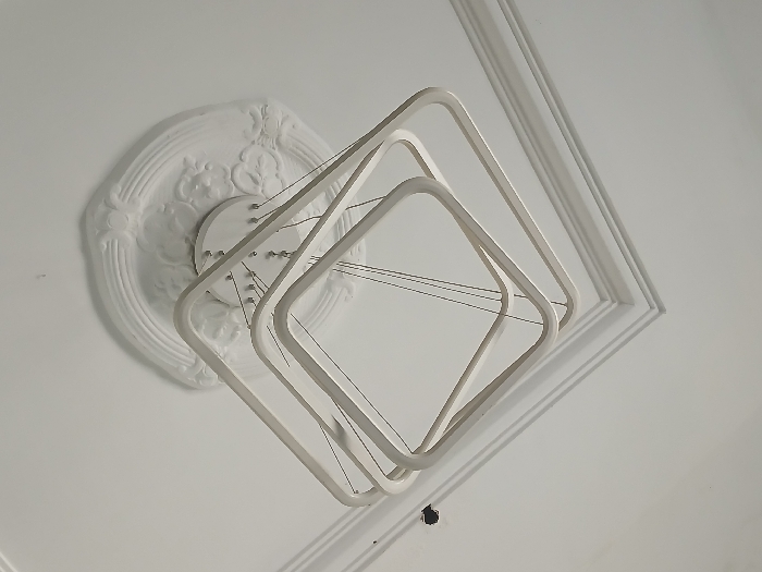 An indoor scene in Lokoja, Nigeria, depicts a white ceiling with a modern chandelier suspended from its center. The chandelier comprises three concentric, rounded square or rectangular frames, varying in size, suspended by thin wires from a central circular base. This base is affixed to an ornate, white, circular ceiling medallion featuring relief scrollwork patterns. The ceiling itself is white and includes decorative crown molding along the visible corner. A small, dark, circular hole is present on the white ceiling surface, positioned to the upper left of the light fixture. No individuals or discernible actions are present.