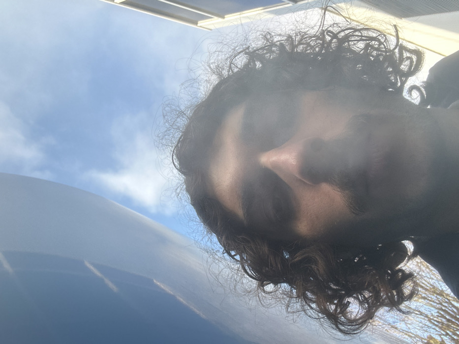 The image is a low-angle portrait of an adult male, captured outdoors in Chatou, France. The subject, positioned centrally and filling the lower half of the frame, has dark, curly hair, a mustache, and a goatee. His face is partially obscured by a significant white lens flare or mist originating from the lower-center, affecting the nose and mouth area. The subject's eyes are partially visible, shaded. Only the dark upper garment of the subject is discernible around the shoulders. The background consists of a bright blue sky with scattered white clouds. To the left, a large, curved, reflective architectural surface, possibly glass or polished metal, reflects the sky. To the right, the corner of a light-colored building with distinct vertical and horizontal lines is visible. Faint, bare tree branches are present in the lower-left background. The scene is illuminated by natural daylight.