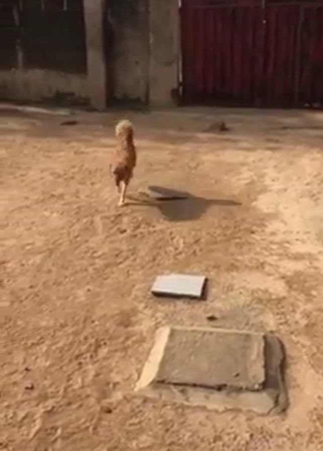 A medium-sized, tan-colored dog with a bushy tail approaches the camera on a sunny day