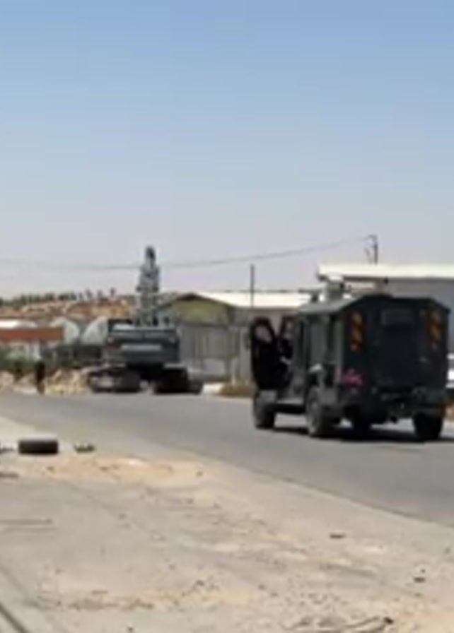 Okay, here's a description of the scene in the video: The video depicts an outdoor setting on a sunny day. The environment appears to be a relatively undeveloped area, possibly an industrial or semi-rural location, with a mix of structures and open space. In the foreground, there's an asphalt road with some loose dirt or gravel on the shoulder. To the left of the road, there is a structure or setup consisting of stacked items. On the right side of the road, there is a parked vehicle and an adjacent building which is a large shed or warehouse-like structure with several parked cars in front of it. Further down the road, in the center of the frame, a heavy construction vehicle, specifically an excavator, is visible. A dark, armored vehicle is parked on the road, with its driver's side door open. In the background, there appears to be a slight rise in terrain or a hill. The sky is clear and blue.