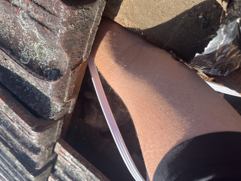 A close-up shot shows roof tiles with patches of lichen alongside a fair-skinned forearm wearing black clothing. A white cable runs between the arm and the tiles. Some kind of trash is visible to the right of the forearm. The arm is positioned towards the center of the frame, with the tiles to the left and the trash to the upper right. The image is well-lit, highlighting textures of the tiles and details of the arm.