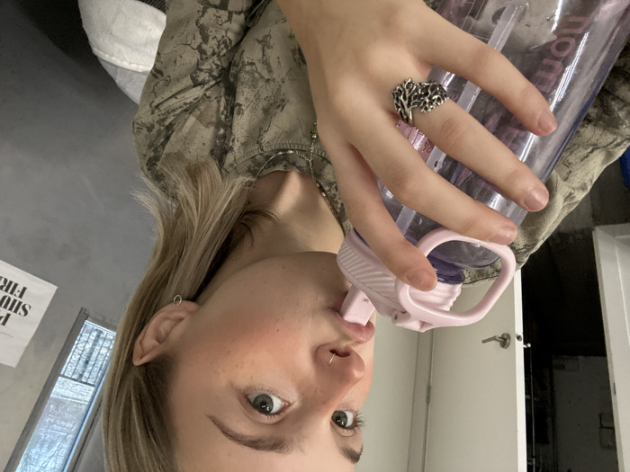 A young woman drinks from a pink water bottle, holding it with her left hand, which is adorned with a silver tree-shaped ring. She has blonde hair, light skin, and green eyes. She is wearing a jacket with a nature-inspired camouflage pattern. The background includes a white door, a window, and a sign with illegible text. The image is slightly tilted counter-clockwise.