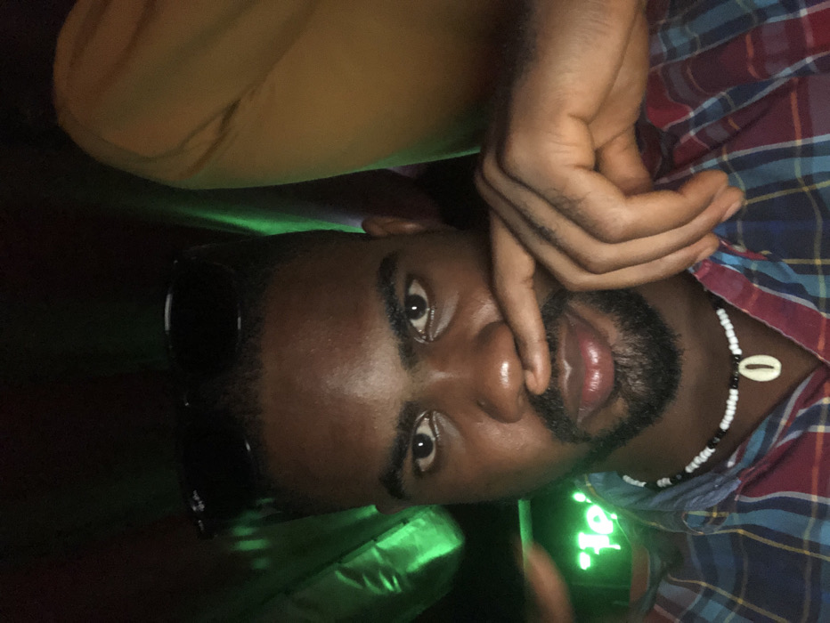 The image depicts a close-up portrait of an adult male in a dimly lit indoor setting in Awka, Nigeria