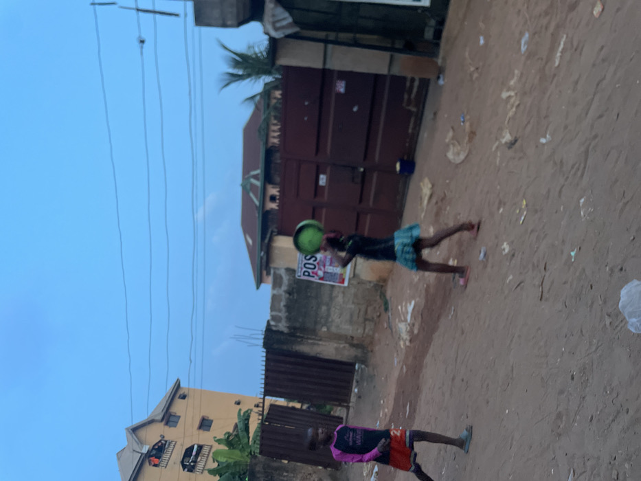 Two children are playing in a sandy, litter-strewn area. One child dribbles a green ball, facing right, with a short skirt. The other child is running, facing forward, wearing a black shirt with pink sleeves and orange shorts. In the background are buildings, fences, and overhead power lines. There is a sign on a concrete wall. The sky is visible above.