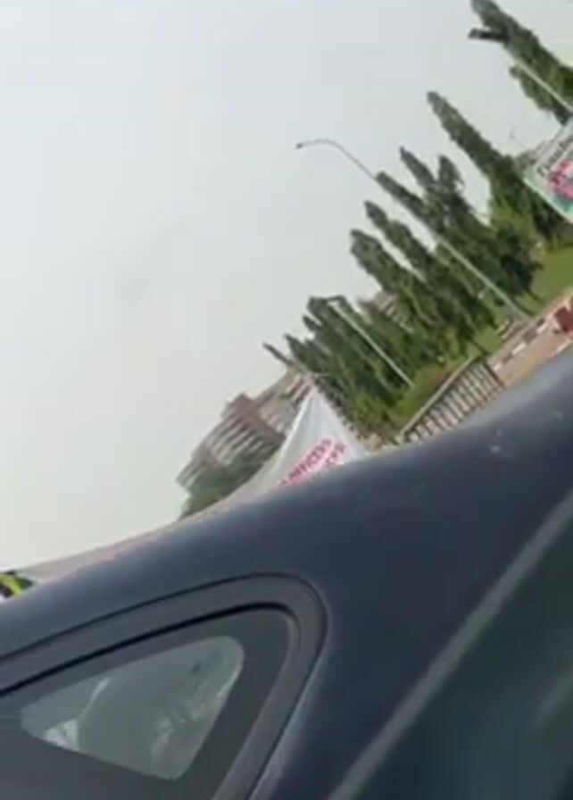 The video, shot from inside a vehicle, shows a view obstructed by the car's body, focusing on a protest