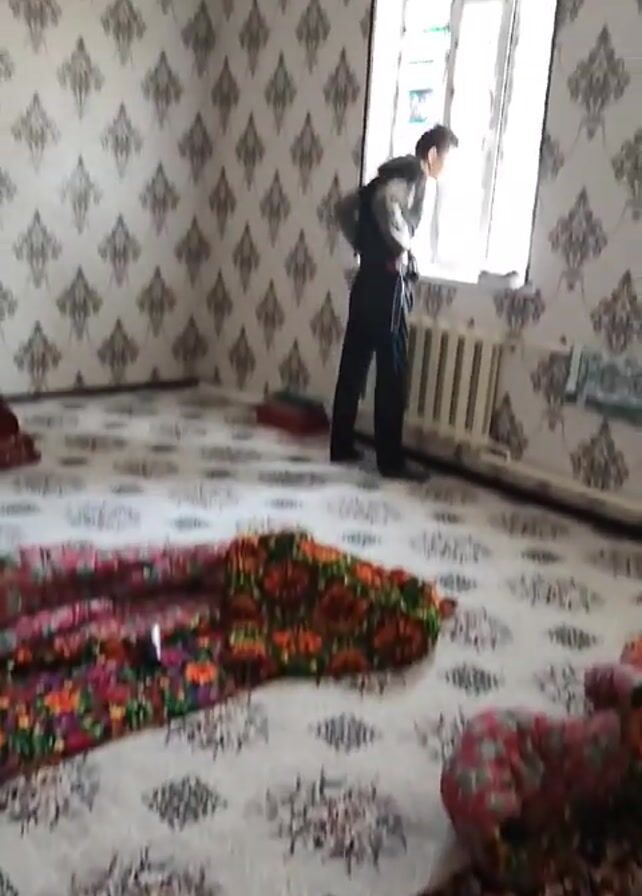 interior of a room. The walls are covered in patterned wallpaper, and the floor is similarly patterned with matching colors. There is a radiator under a white window with white trim. A person in dark clothing is looking out the window. The video is shot from a low angle, looking upwards, and the camera moves around the room. There are cushions and a colorful textile on the floor.