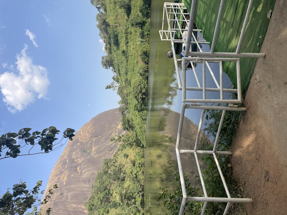 This image presents a panoramic outdoor scene located in Abuja, Nigeria. The foreground features a light grey metal railing with horizontal bars and vertical posts, indicating a barrier or gate. To the left, the ground is reddish-brown soil with sparse green vegetation. To the right, behind the railing, a section of bright green artificial turf extends towards a body of water. The midground is dominated by a calm, greenish-brown lake or reservoir that reflects the surrounding landscape. On the right side of the lake, a floating dock, also covered in green artificial turf, is visible. Moored near the dock are two small boats: one light-colored boat with an outboard motor mounted at its stern, and a smaller, darker object partially obscured next to it. The background on the left is characterized by a large, smooth, greyish-brown rock formation, likely an inselberg, exhibiting vertical striations. Dense green foliage, comprising trees and shrubs, covers the slopes leading down to the lake's edge and extends across the middle distance. On the right, rolling green hills dotted with trees rise towards the horizon. The sky is clear blue with several distinct white cumulus clouds. A dark-leaved tree branch hangs into the upper-left portion of the frame. No individuals are present in the scene.