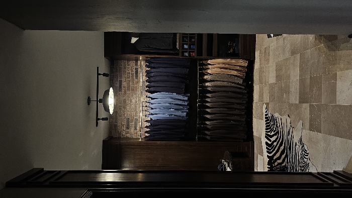 The image depicts a well-organized walk-in closet. Clothes are neatly stacked, with dark and light blue jeans visible. Accessories are organized on shelves above. A wall-mounted light fixture is positioned to the left. The closet has a rustic-modern aesthetic, featuring brick walls and wooden shelves, alongside stone-tiled flooring. A zebra print rug adds a touch of visual interest to the space. The closet is viewed from a slightly obscured perspective, framed by architectural details.