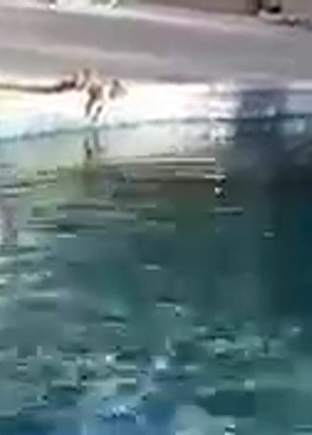 dog jumping into a pool. The dog is on the edge of the pool and leaps into the water. The pool water is blue and rippling. The pool deck is a light color. The dog appears to be a medium-sized breed with light-colored fur. The video is taken from a distance, making details blurry.